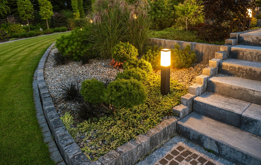 Install landscape lighting along pathways or around focal points like trees and gardens.